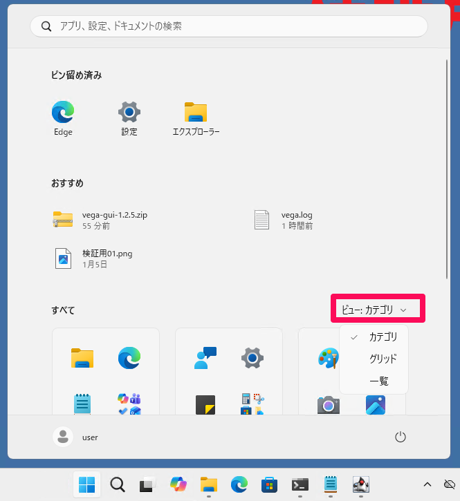 新スタートメニューでは、アプリ一覧の表示方式を切り替えられる。
